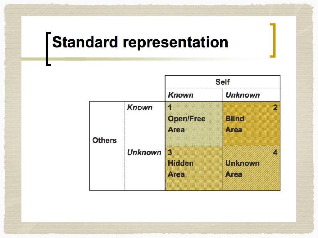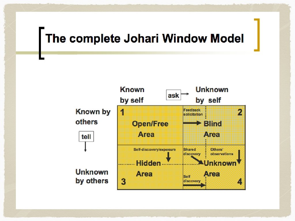 Partner up and compare and contrast your diagrams. What can we potentially learn about ourselves from the Johari window?