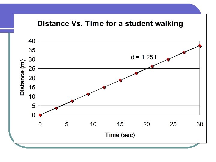 Graphs of Motion l When graphing distance vs. time, the slope of the graph is the velocity