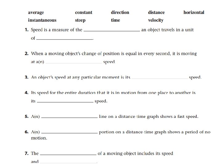 5. ____ is the total distance traveled divided by the total time it took to go that distance. 6. The equation for average speed is v = d/t , where the symbol v stands for average speed, d stands for total _____ , and t stands for total time.