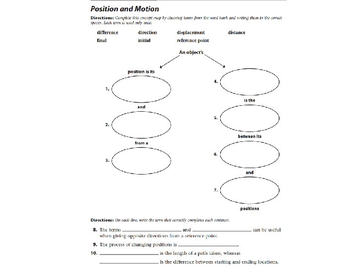 A. Describing Position 1. A(n) ____is a starting point you choose to describe the location, or position, of an object. 2. A(n) ____is an object’s distance and direction from a reference point. 3. A complete description of a position includes a distance, a(n) ____, and a reference point.