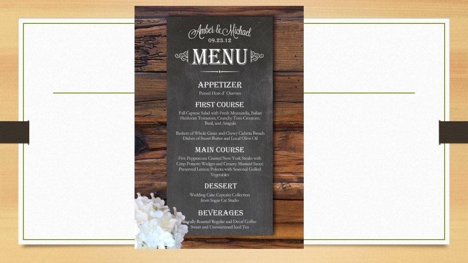 The name of the dish may indicate the method of cooking • • Boiled carrot Fried fish Baked potatoes Smoked beef Breaded cheese • Poached trout