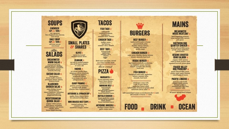 Description of dishes • Main ingredients (underline) • Method of cooking (bold) • Method od serving (italic) Homemade leek and potato soup Hot and tasty combination of fresh leeks and potato seasoned with fresh herbs