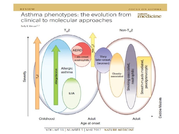 FENOTIPOS EN ASMA Y SUS CORRESPONDIENTES ENDOTIPOS Fenotipo Historia Natural Hallazgos clínicos y Patobiología y Biomarcadores fisiológicos Genética Respuesta a tratamiento Alérgico de Inicio temprano (niños y prescolares) Síntomas alérgicos y otras enfermedades (rinitis y dermatitis atópica) Ig. E específica; Th 2 citokinas Eosinófilia; (IL-4, IL-5, IL-13); Eosinofilia; engrosamiento de MBS 17 q 12 Eosinofílico Eosinofílica de inicio Eosinofílica tardío de inicio tardío Inicio adultos, severaadultos, Inicio severa Sinusitis; pólipos nasales; poco alérgica Sinusitis; pólipos AERD (Enfermedad nasales; poco alérgica Respiratoria AERD (Enfermedad Exacerbada por Respiratoria Aspirina) por Exacerbada Aspirina) Leve; intermitente con ejercicio Refractaria a CS; eosinofilia; IL-5, IL-13; cysteinyl Refractaria a CS; eosinofilia; leukotrienos C 4, D 4 Y E 4 IL-5, IL-13; cysteinyl leukotrienos C 4, D 4 Y E 4 Asm Inducido por Ejercicio Relacionado a obesidad Neutrofílico i c so a a Inicio adultos Mujeres; muy. HRB no sintomáticas; muy claro; HRB no muy claro; a a ad 2 h T Activación de Mastocito; Th 2 citokinas; cysteinyl Activación de Mastocito; leukotrienos leukotrieno Th 2 citokinas; cysteinyl leukotrieno No Th 2; stress oxidativo Asma no asociada a Th 2 VEF 1 muy bajo; Neutrofilia en esputo; mucho atrapamiento aéreo Activación de respuesta inmune innata Th 17; IL-8; Corticosteroides; Resp. Corticostero Anti-Ig. E; ides; Anti-Ig. E; Anti-IL-5; Anti-IL-4/IL-13 Inmunoterapia onde a CS Responde Anti-IL-5; ATLR; Responde Parcialmente a Anti-IL-5; ATLR; CS (altas dosis); Parcialmente a Anti-IL 13? CS (altas dosis); Anti-IL 13? Responde ATLR, beta-2 agonistas, Responde ATLR, Anti-IL-9 beta-2 agonistas, Anti-IL-9 Pérdida de peso; antioxidantes; terapia hormonal? Resistencia a CS; Macrólidos? ; Anti-TNF-α; Teofilinas? Wenzel S. Nature Med 2012; 18 (5): 716 -725 / Agache C, et al. Allergy 2012; 67: 835 -846