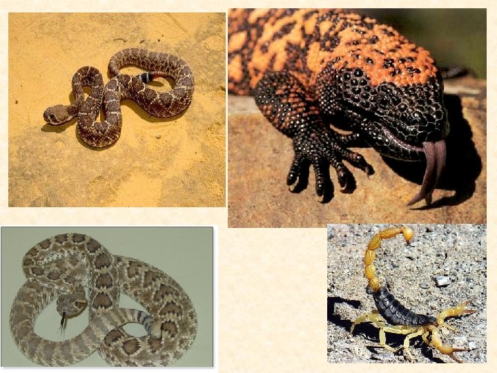 Animals of the Desert • Snakes • Rattlesnakes • Mojave rattlesnake • Lives in the Mojave Desert • Length 2 -4 ft • Is considered one of the most venomous snakes in the U. S. • Venom is neurotoxin • Western Diamondback Rattlesnake • Range is Central/West Texas to Southern New Mexico/California • Length 3 -5 ft but some can get as long as 7 • Venom is hemotoxin