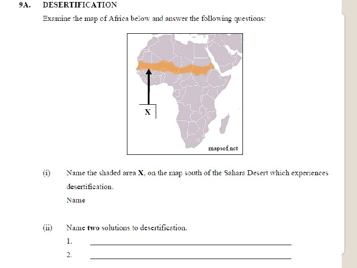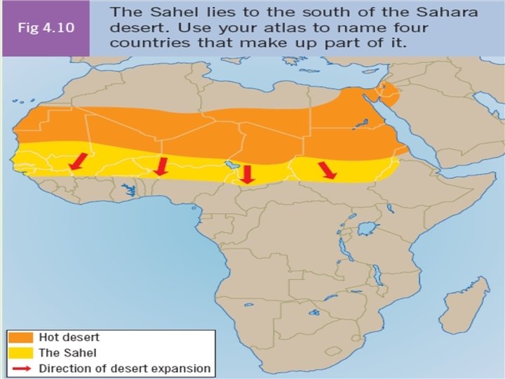 Causes of desertification �Rapid population growth means there are more people to feed and house. �More trees being cut for fuel, houses and farms so the roots do not hold the soil. �Land being over-cultivated (too much crops) makes the soil infertile.
