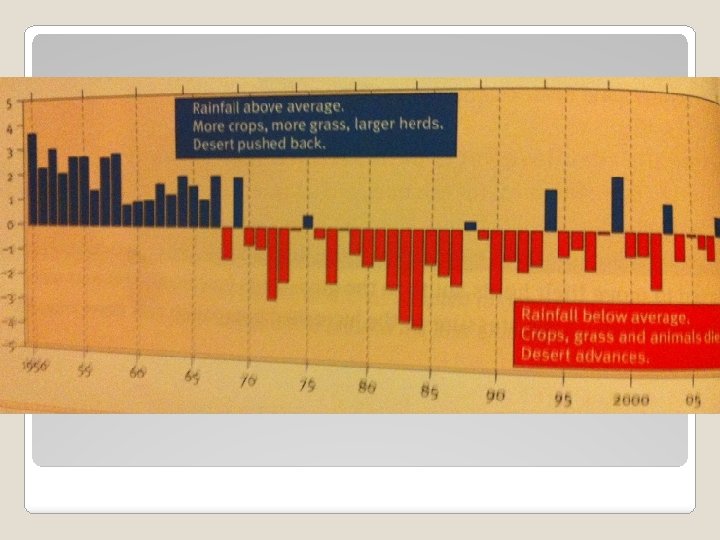 Causes of desertification �Land is also being over-grazed ( animals stripping the land bare). �Global warming causing less rain and higher temperatures has also been blamed. �Land becomes dry and worn out and blows away the barren top soil.