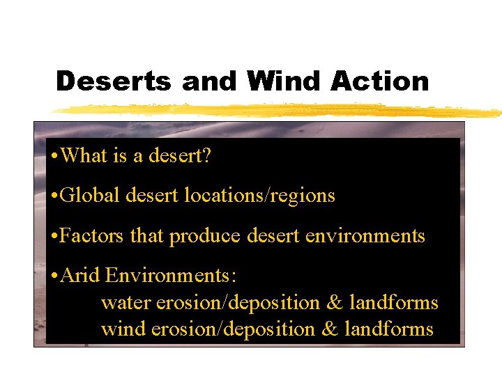 Deserts and Wind Action • What is a desert? • Global desert locations/regions • Factors that produce desert environments • Arid Environments: water erosion/deposition & landforms wind erosion/deposition & landforms
