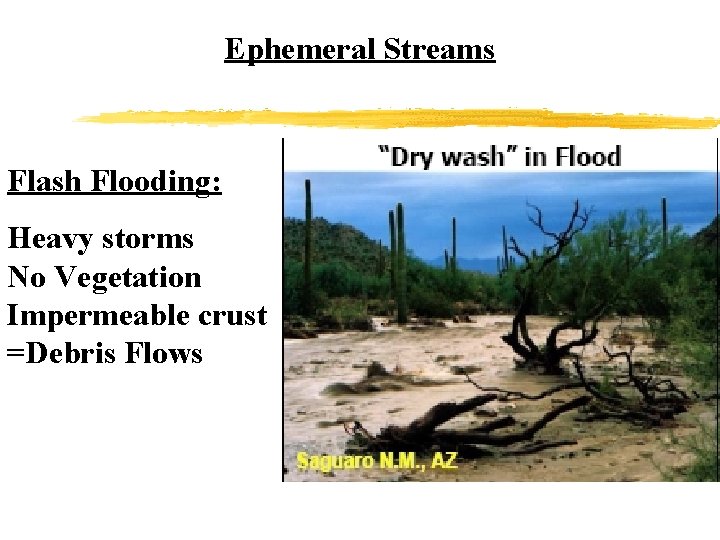 Ephemeral Streams Flash Flooding: Heavy storms No Vegetation Impermeable crust =Debris Flows