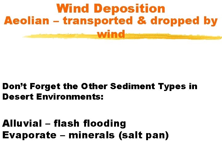 Wind Deposition Aeolian – transported & dropped by wind Don’t Forget the Other Sediment Types in Desert Environments: Alluvial – flash flooding Evaporate – minerals (salt pan)