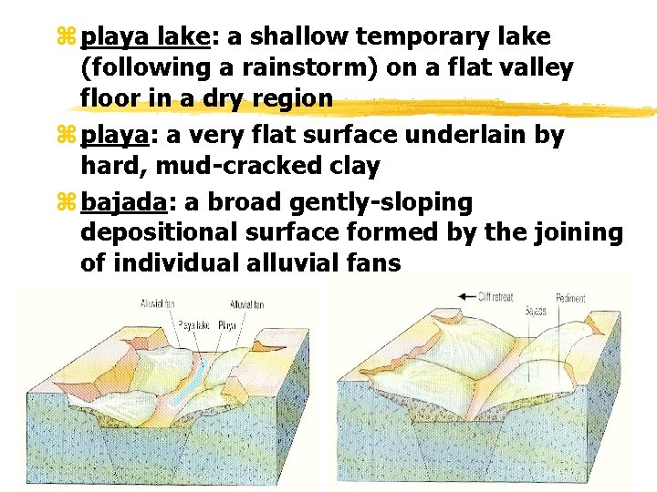 z playa lake: a shallow temporary lake (following a rainstorm) on a flat valley floor in a dry region z playa: a very flat surface underlain by hard, mud-cracked clay z bajada: a broad gently-sloping depositional surface formed by the joining of individual alluvial fans