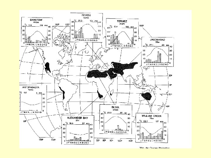 Causes of regional aridity • Persistent atmospheric subsidence associated with the presence of sub-tropical anticyclones suppresses convectional activity (e. g. Sahara, Kalahari, Australia) • Absence of humid airstreams (e. g. Gobi) • Localized subsidence in rain-shadow areas (e. g. Great Basin) • Absence of cyclonic disturbances (e. g. Sonora) • Inhibition of convectional activity by cold coastal currents (e. g. Atacama, Namib)