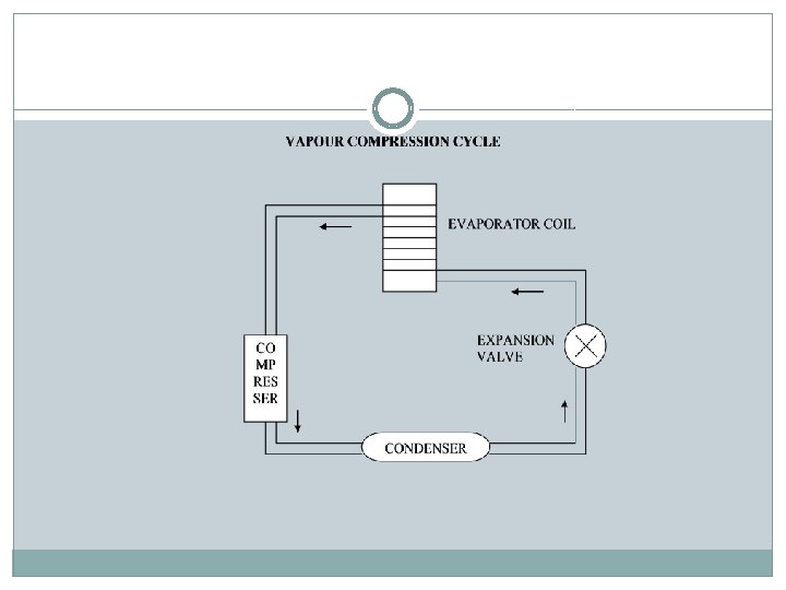 REFRIGERATION CYCLE VAPOUR COMPRESSION � The low pressure vapour in dry state is drawn from the evaporator during the suction stroke of the compressor. � During compression stroke the pressure and temperature increases until the vapour temperature is greater than the temperature of condenser cooling medium.