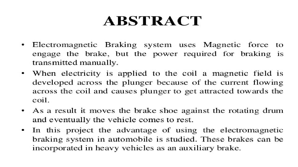 ADVANTAGES ØNo friction loss ØLess heat loss ØLess wear of components ØFully electromagnetically controlled ØGreat braking efficiency potential to regain energy lost in braking ØNo need to change brake oils regularly ØNo oil leakage ØProblem of brake fluid vaporization and freezing is eliminated ØLess maintenance cost ØLonger life span compare to other brakes