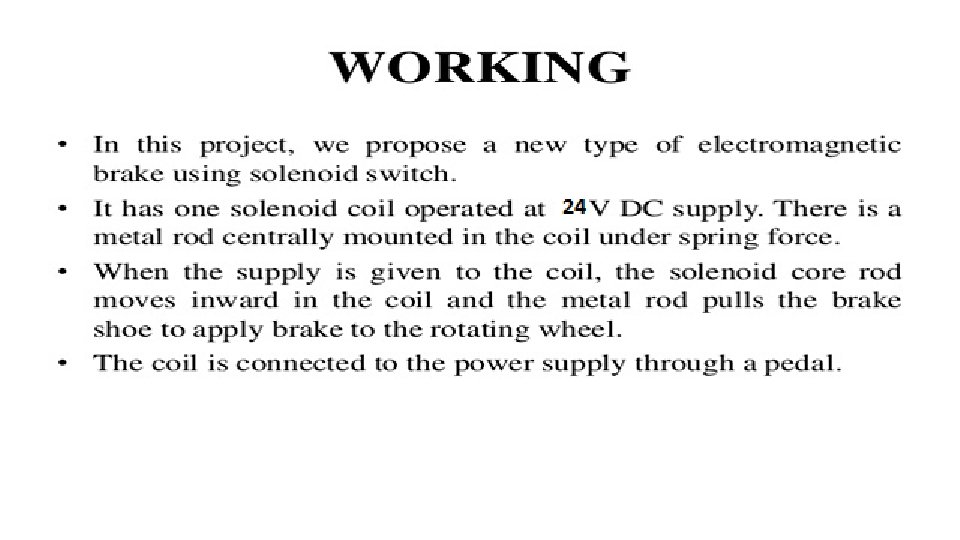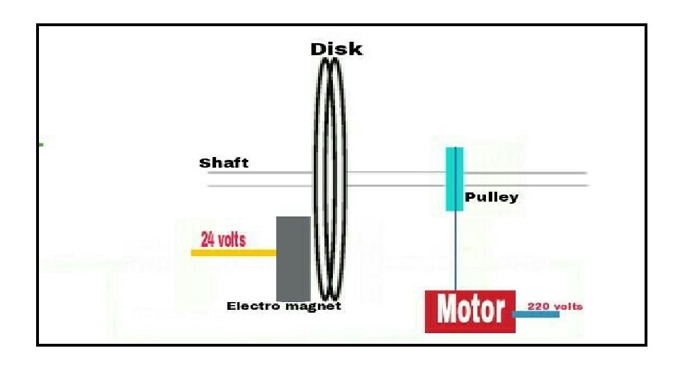 WORKING PRINCIPLE Ø. When the electric power is supply to the motor it will be rotating based upon the accelerator to required speed the motor can be rotate the shaft for using the one rope from the motor to the pulley. The pulley can be set to the shaft. Depending upon the motor speed the shaft can be rotate. The disc can be set the center now we ready to stop the disc can be set to the center of the shaft. The rotating shaft can be stop using the electromagnet. The electromagnet can be working on the supply of battery power. ØThe electromagnet works only the supply of the battery voltage that voltage is 24 voltage capacity battery. The supply of the power to the motor and shaft it will be rotating shaft can be stop using the electromagnet. The electromagnet can be applied to stop using the one switch type It will be work only on the switch is in on position the magnet can act like the electromagnet. In case the switch is in off position the magnet cannot be work like electromagnet.