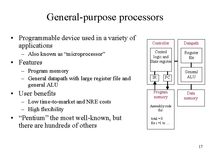 Processor technology • Processors vary in their customization for the problem at hand Desired functionality General-purpose processor total = 0 for i = 1 to N loop total += M[i] end loop Application-specific processor Single-purpose processor 16