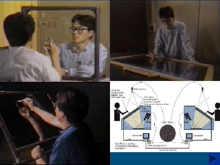 NTT - Human Interface Labs Thèmes: espace de travail/ espace interpersonnel l’importance du geste et du regard « gaze » situer son collaborateur en contexte faire disparaître l ’interface «seamless collaboration» espace de travail partagée Dessin (fait par B) dans un fenêtre d ’édition B pointe avec sa main Écriture en temps réel par A fenêtres vidéo