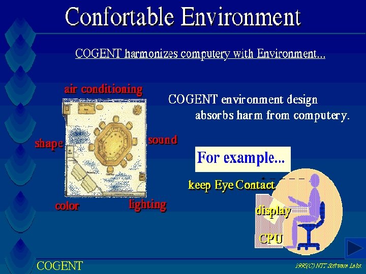Buts de la recherche: • Faciliter la communication informelle tout en renforcant le sentiment de la présence Arrière-plan continu • Respect des protocoles sociaux en fournissant des indices • communication non-verbal • accroître la conscience de l’espace (spatial awareness) • taille de l’image, • distance interpersonnelle, • fond partagé, • interfaces intuitives (Whisper Chair)