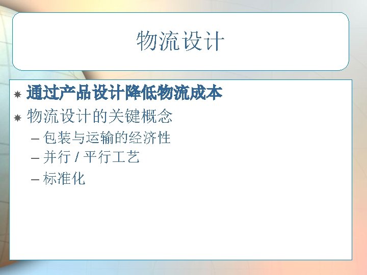 Design For Logistics Design for Logistics uses product design to address logistics costs Key Concepts of Design for Logistics – Economic packaging and transportation – Concurrent/Parallel Processing – Standardization