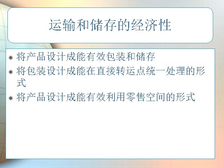 Economic Transportation and Storage Design products so that they can be efficiently packed and stored Design packaging so that products can be consolidated at cross docking points Design products to efficiently utilize retail space