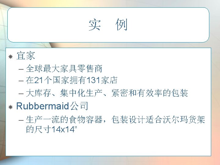 Examples Ikea – World’s largest furniture retailer – 131 stores in 21 countries – Large stores, centralized manufacturing, compactly and efficiently packed products Rubbermaid – Clear Classic food containers - designed to fit 14 x 14” Wal-Mart shelves