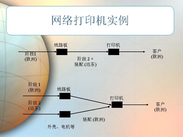 The Network Printer Example Board Stage 1 (Europe) Printer Customer (Europe) Stage 2 + Integration (Far East) Board Printer Stage 2 (Far East) Customer (Europe) Plastics, motors, etc. Integration (Europe)