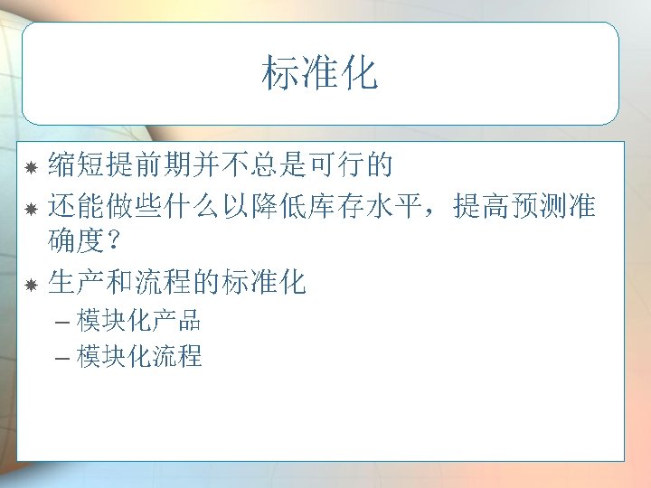 Standardization Shortening lead times is not always possible How else can inventory levels be reduced and forecast accuracy improved? Standardization of products and processes – Product commonality – Process commonality