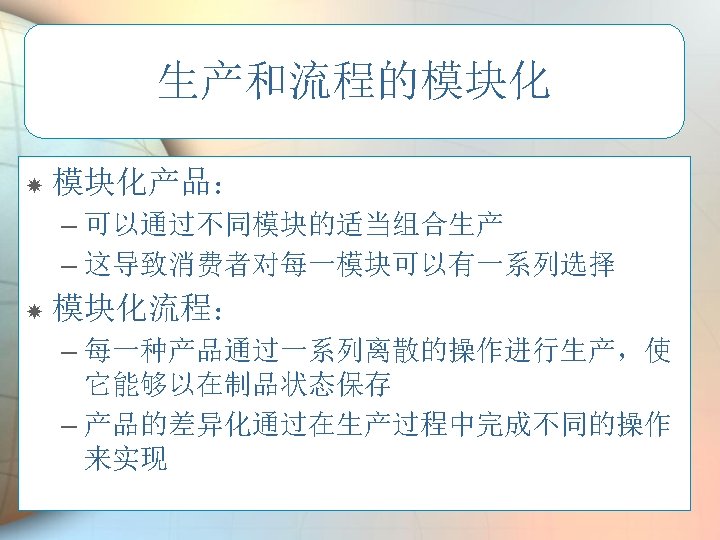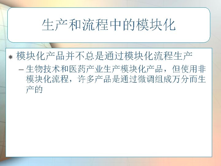 Modularity in Product and Process Modular products are not always made from modular processes – Bio-tech and pharmaceutical industries make modular products but use non-modular processes; many products are made by varying the mix of a small number of ingredients