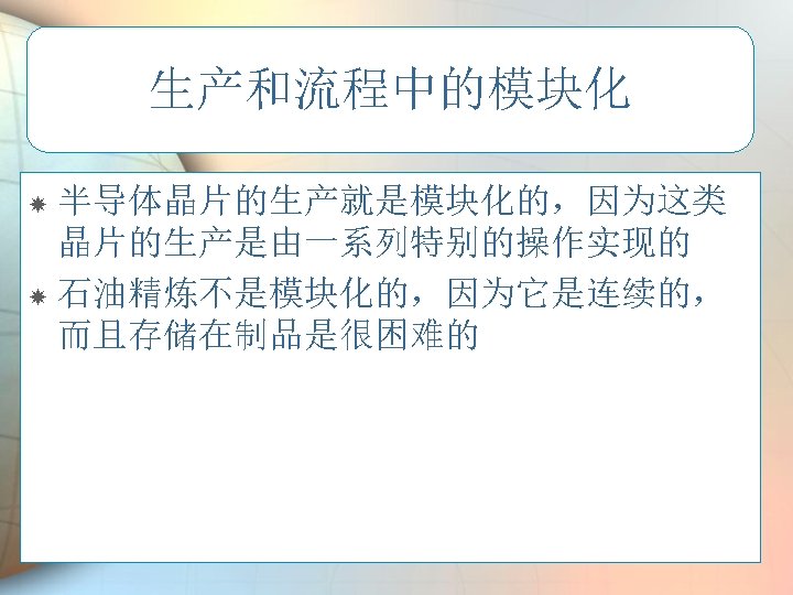 Modularity in Product and Process Semiconductor wafer fabrication is modular since the type of chip produced depends on the unique set of operations performed Oil refining is not modular since it is continuous and inventory storage of semifinished product is difficult