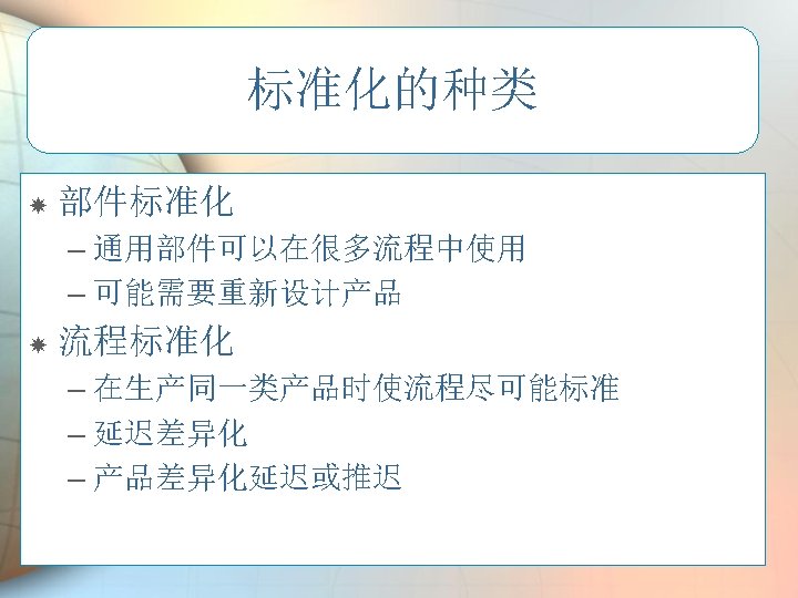 Types of Standardization Part Standardization – Common parts are used across many processes – Product redesign might be necessary Process Standardization – Standardizing as much of the process as possible, making a generic or family product – Delaying differentiation – Called “Delayed differentiation”, “Postponement”