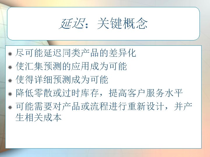 Postponement: Key Concepts Delay differentiation of products in the same family as late as possible Enables the use of aggregate forecasts Enables the delay of detailed forecasts Reduces scrapped or obsolete inventory, increases customer service May require new processes or product design with associated costs