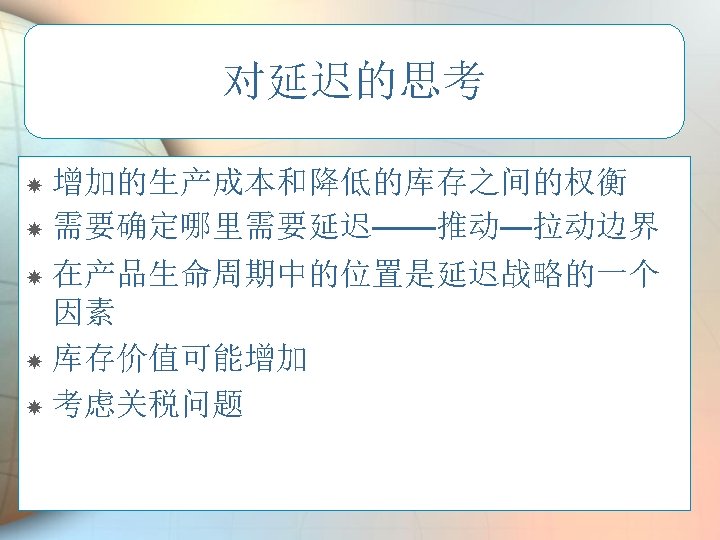 Postponement Considerations Tradeoff increased product cost with decreased inventory Need to decide where to postpone - the push-pull boundary Position in product lifecycle is factor in postponement strategies Inventory value may increase Consider tariffs and duties