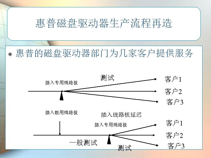 Hewlett-Packard Disk Drives Manufacturing Process Redesign HP’s disk drive division supplied several customers PCB Insertion Coupon Insertion tests Customer 1 Customer 2 Customer 3 PCB insertion postponed PCB Insertion common tests Customer 1 Customer 2 Customer 3