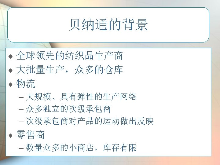 Benetton Background A world leader in knitwear Massive volume, many stores Logistics – Large, flexible production network – Many independent subcontractors – Subcontractors responsible for product movement Retailers – Many, small stores with limited storage
