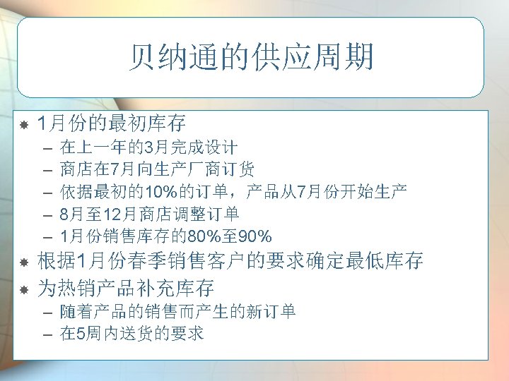 Benetton Supply Cycle Primary collection in stores in January – – – Final designs in March of previous year Store owners place firm orders through July Production starts in July based on first 10% of orders August - December stores adjust orders (colors) 80%-90% of items in store for January sales Mini collection based on customer requests designed in January for Spring sales To refill hot selling items – Late orders as items sell out – Delivery promised in less than five weeks