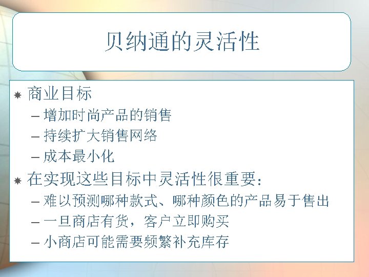 Benetton Flexibility Business goals – Increase sales of fashion items – Continue to expand sales network – Minimize costs Flexibility important in achieving these goals – Hard to predict what items, colors, etc. will sell – Customers make requests once items are in stores – Small stores may need frequent replenishments