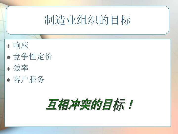 The Goals of the Manufacturing Organization Responsiveness Competitive pricing Efficiency Customer service