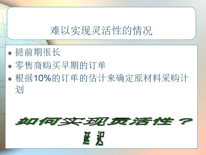 It is hard to be flexible when. . . Lead times are long Retailers are committed to purchasing early orders Purchasing plans for raw materials are based upon extrapolating from 10% of the orders