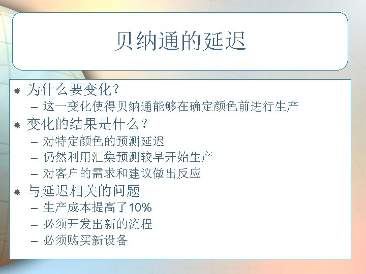 Benetton Postponement Why the change? – The change enables Benetton to start manufacturing before color choices are made What does the change result in? – Delayed forecasts of specific colors – Still use aggregate forecasts to start manufacturing early – React to customer demand suggestions Issues with postponement – Costs are 10% higher for manufacturing – New processes had to be developed – New equipment had to be purchased