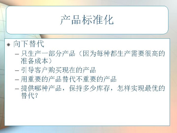 Product Standardization Downward Substitution – Produce only a subset of products (because producing each one incurs high setup cost) – Guide customers to existing products – Substitute products with higher feature set for those with lower feature set – Which products to offer, how much to keep, how to optimally substitute ?