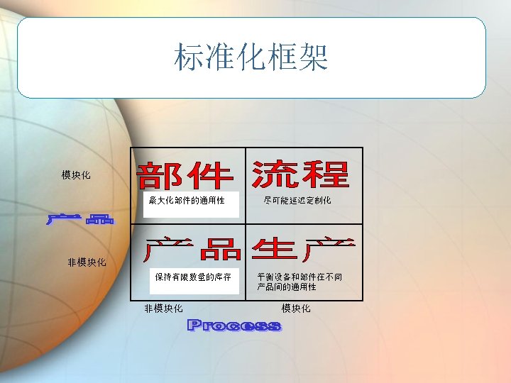 A Framework for Standardization Modular Maximize component commonality across products Delay customization as late as possible Non-Modular Carry a limited number of products in inventory Non-Modular Leverage equipment and part commonality across products Modular