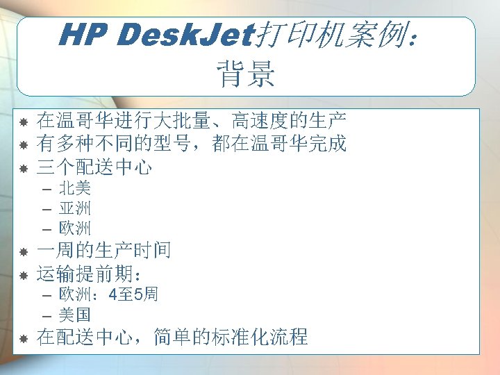 HP Desk. Jet Case: Background High volume, high speed manufacturing in Vancouver Many different models, all completed in Vancouver Three distribution centers – North American – Asian – European Manufacturing time one week Transportation lead times: – Europe: 4 -5 weeks – US At distribution centers, simple standardized process