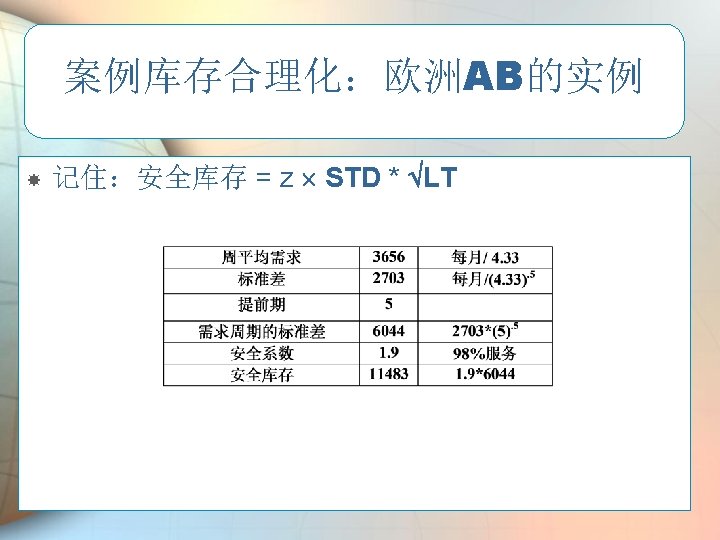 Safety Stock Rationalization: Example Europe AB Recall: Safety Stock = z STD * LT