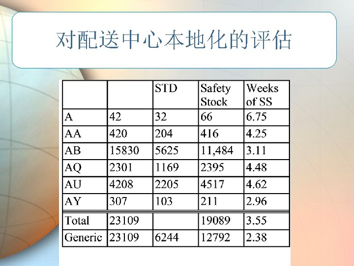 对配送中心本地化的评价 在配送中心本地化中,在保持一定的服务水 平时,可以利用风险分担降低总库存 为了评估库存,To evaluate inventory, compare total safety stock held if individual localized units are held in inventory or if generic units are held 必须评估其他成本