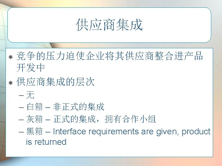Supplier Integration Competitive forces are driving firms to integrate suppliers into product development Spectrum of Supplier Integration – None – White Box – Informal integration – Grey Box – Formal integration, with collaborative teams – Black Box – Interface requirements are given, product is returned