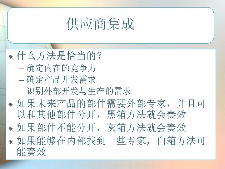 Supplier Integration What approach is appropriate? – Determine internal competencies – Determine product development needs – Identify external development and manufacturing needs If future products have components that require external expertise and can be separated from other components, a black box approach makes sense. If components cannot be separated, a grey box approach makes sense. If some expertise can be found in house, a white box approach might make sense.