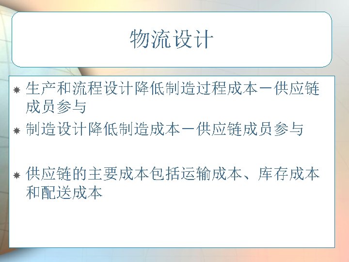 Design For Logistics Product and process design key cost drivers of product cost Design for Manufacturing used design to decrease manufacturing costs Major supply chain costs include transportation costs, inventory costs, distribution costs