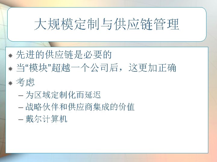 Mass Customization and Supply Chain Management An advanced supply chain is essential This is particularly true when “modules” extend beyond a single company. Consider – Postponement for regional customization – The value of strategic partnerships and supplier integration – Dell