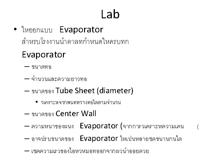 Evaporator Diameter • The diameter of evporator has an important effect on entrainment. • Area of horizontal cross section should provide 1 m 2/400 m 3/h of vapor produced. • The velocity of vapor leaving the liquid surface should not be higher than 4. 6 m/s