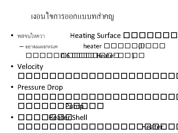 Tube Diameter Heat Transfer Area Length Number of Tube Recommended Juice Velocity 1. 5 – 2. 1 m/s Higher Juice Velocity - enhance heat transfer + retard scale formation Too high juice velocity - too high pressure drop - optimum pressure drop is 0. 7 – 1. 8 kg/cm 2
