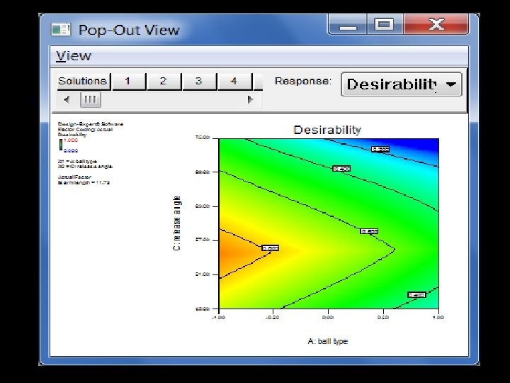 Maximum Desirability • Modeled response equation allows hitting the target distance of 84, d=1 • Best possible standard deviation according to model is 1. 475 • d (for std dev) = (3 -1. 475)/(3 -1) =. 7625 • D = SQRT(1*. 7625) =. 873